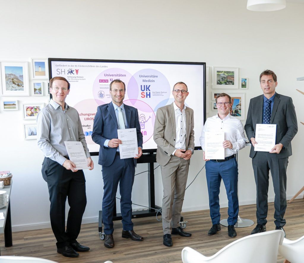 Soldan sağa: Ralf Bruder (Lübeck Üniversitesi Robotik ve Bilişsel Sistemler Enstitüsü), Prof. Dr. Ibrahim Alkatout (Kurt-Semm Merkezi ve UKSH Kiel Kampüsü Kadın Hastalıkları ve Doğum Kliniği), Dijitalleşme Bakanı Dirk Schrödter, Henrik Guschov (Vater Solution GmbH), Prof. Dr. Kevin Köser (Christian-Albrechts-Üniversitesi Kiel Bilgisayar Bilimleri Enstitüsü). Foto: UKSH