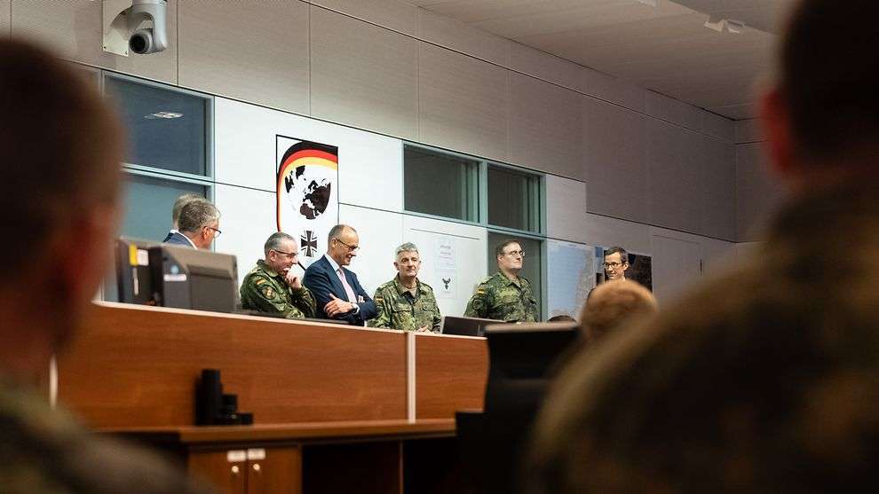 Bundeskanzler Friedrich Merz (M.) beim Besuch des Operativen Führungskommandos der Bundeswehr (OFK) in der Henning-von-Tresckow Kaserne. Foto: Bundesregierung/Steffen Kugler