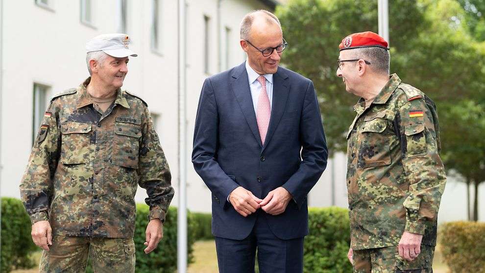 Bundeskanzler Friedrich Merz (M.) vor der Henning-von-Tresckow Kaserne bei der Begrüßung anlässlich seines Besuchs beim Operativen Führungskommando der Bundeswehr, OFK (l. Generalleutnant Alexander Sollfrank, OFK- Befehlshaber; r. Carsten Breuer, Generalinspekteur der Bundeswehr). Foto: Bundesregierung/Steffen Kugler