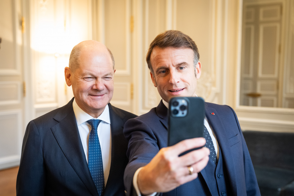 Bundeskanzler Olaf Scholz (l.) und Emmanuel Macron, Präsident Frankreichs (r.), bei einem Selfie im Elysée-Palast.Foto: Bundesregierung / Steffen Kugler