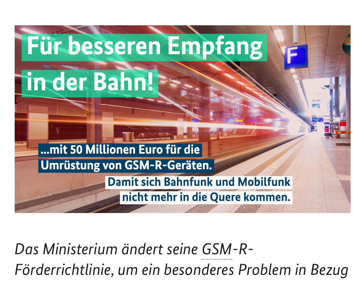 Demiryollarında kullanılan GSM-R sistemi, Avrupa genelinde demiryolu iletişimini sağlıyor. Ancak bu sistemin kullandığı frekansların, kamuya açık mobil iletişim ağına (900 MHz bandı) yakın olması, geçmişte sinyal karışmalarına yol açtı. Bu sorunun çözümü için GSM-R cihazlarının daha dayanıklı ve modern cihazlarla değiştirilmesi zorunlu hale geldi. 2019’dan bu yana BMDV’nin mali desteğiyle, yeni nesil iletişim modülleri trenlere entegre edildi.